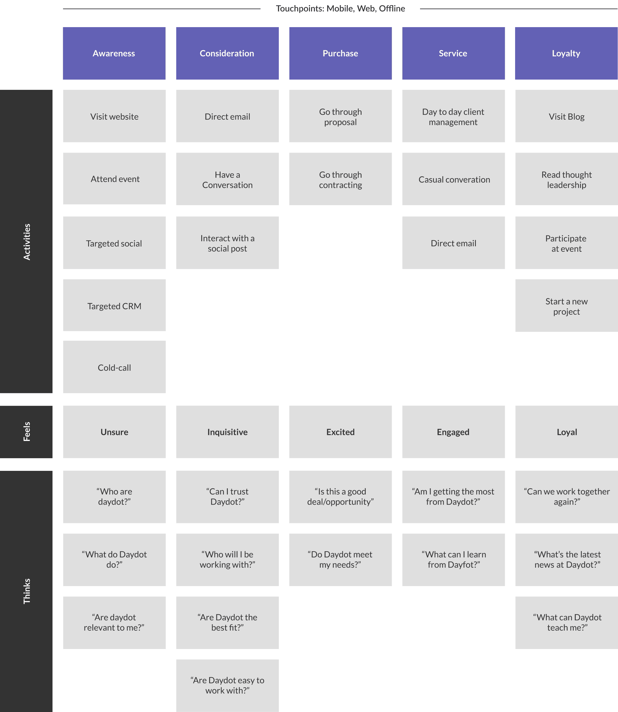 We broke down our personas into user stories to help empathise with their individual needs. We then mapped the user journey across the customer lifecycle, from awareness through to loyalty.
